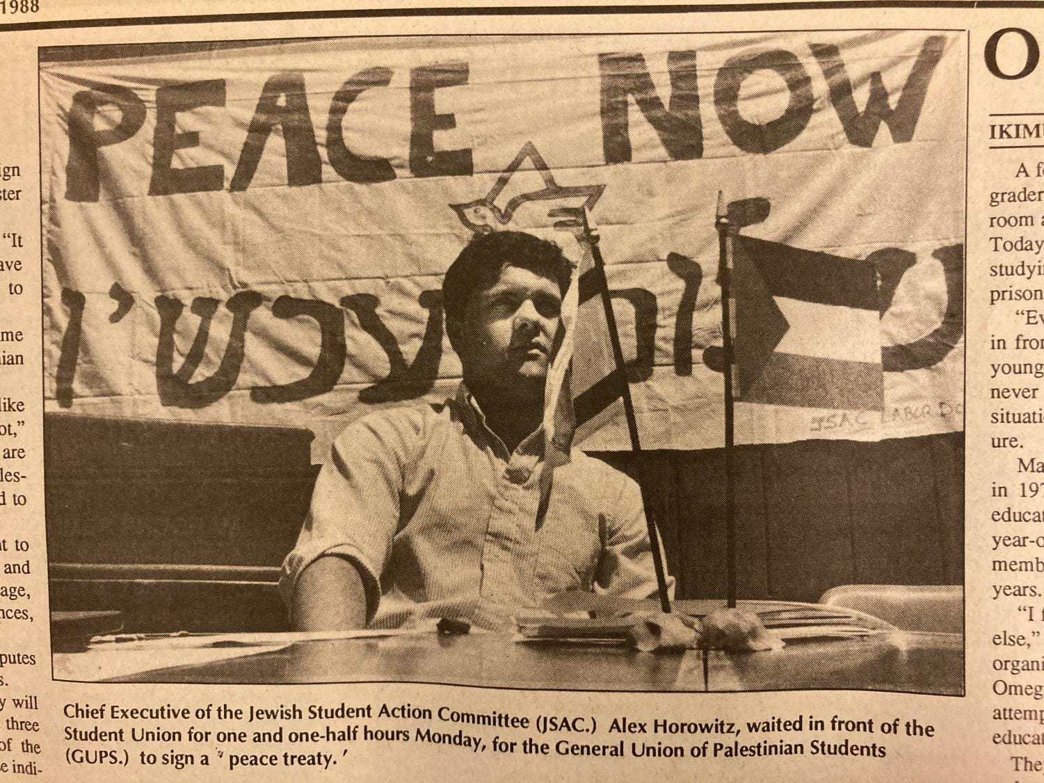 In May 1988, five years before the start of the Oslo Accords, Jewish students sat at a table underneath a banner with the phrase “Peace Now” in large fonts both in English and Hebrew. A dove was painted in the middle of the two slogans, and on the table were small Israeli and Palestinian flags.